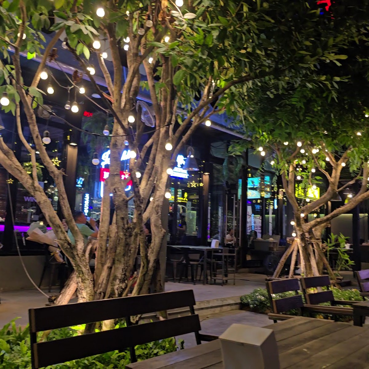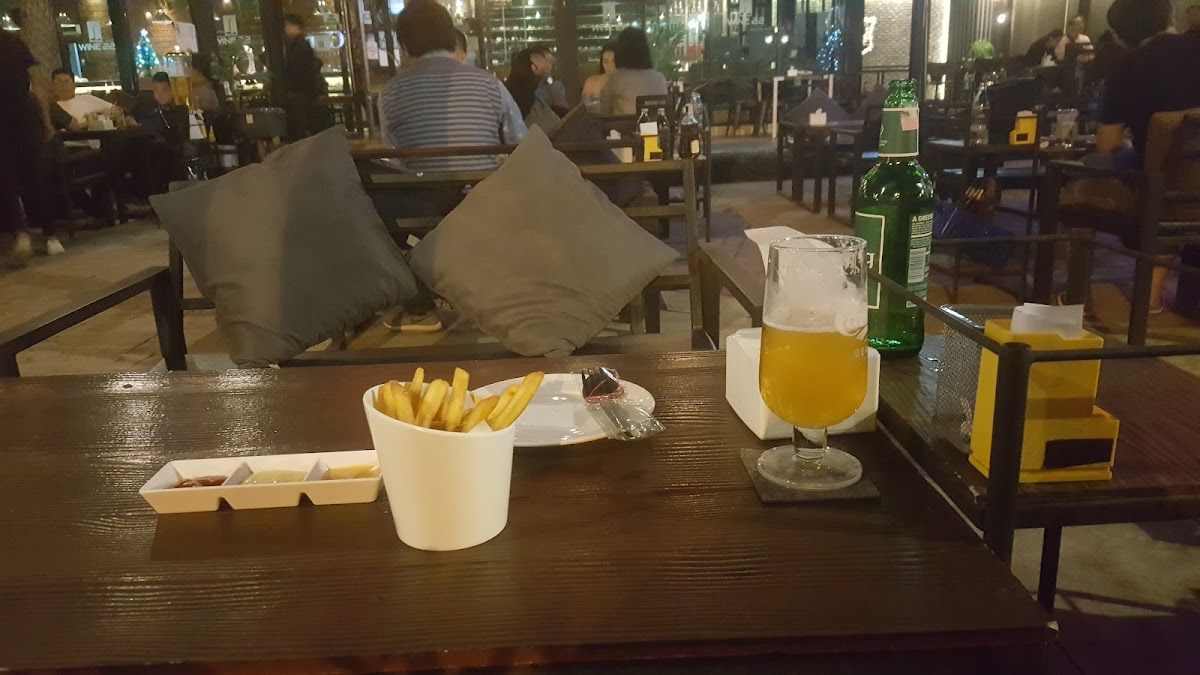 Busy restaurant open air with live music. Cool atmosphere in this kind of lounge garden, full of small lights. I really like it. The food is good and well presented. Many wines are available. Very cheap beer with towers. The service is fast, super fast! Perfect for couple or even big group of friends. Reasonable prices. The live music is loud. If you want to talk remember to take a sit at the bottom of the garden.